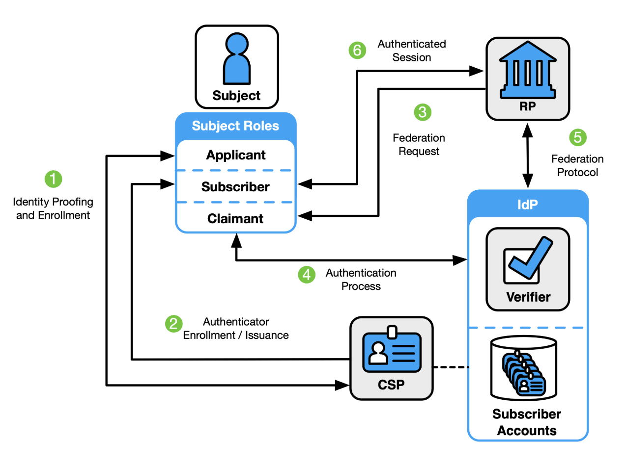 Identity Provider (IdP): Performs authentication for subscribers and issues assertions to relying parties. In federated systems, the CSP and IdP are often the same entity (Google, Okta, your corporate SSO).