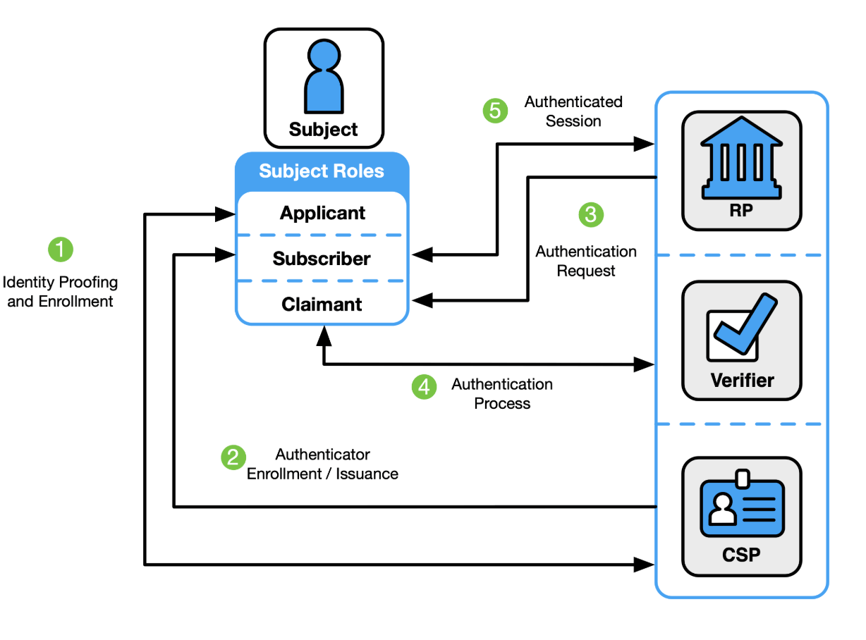 Verifier: Verifies the subscriber’s authenticator. In practice, this is usually the IdP.