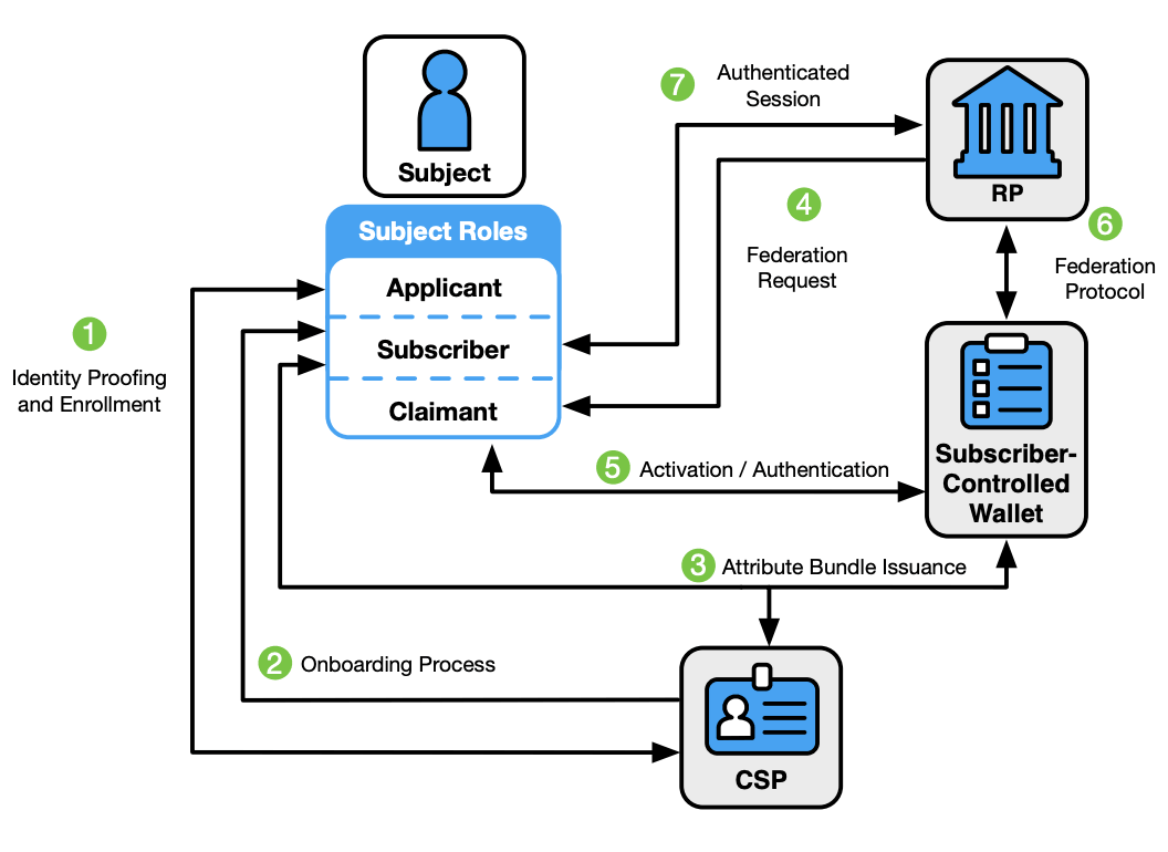 3. Subscriber-controlled wallet: New in 800-63-4. The CSP issues signed attribute bundles (verifiable credentials) directly to the subscriber. The subscriber’s wallet manages them and presents them directly to RPs, without the IdP being involved at assertion time.